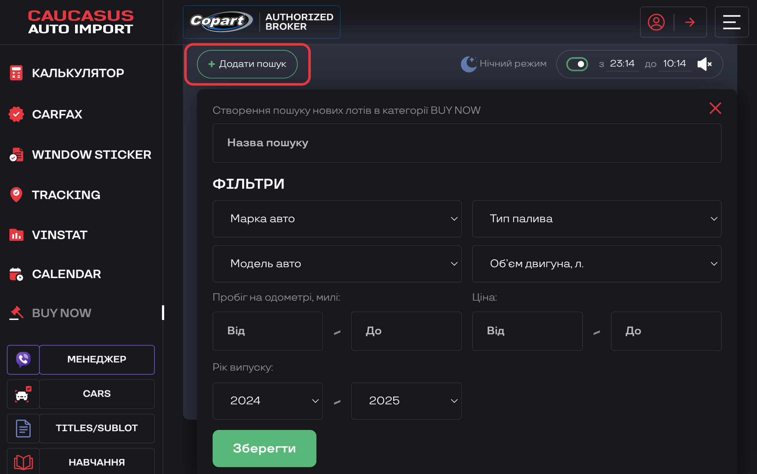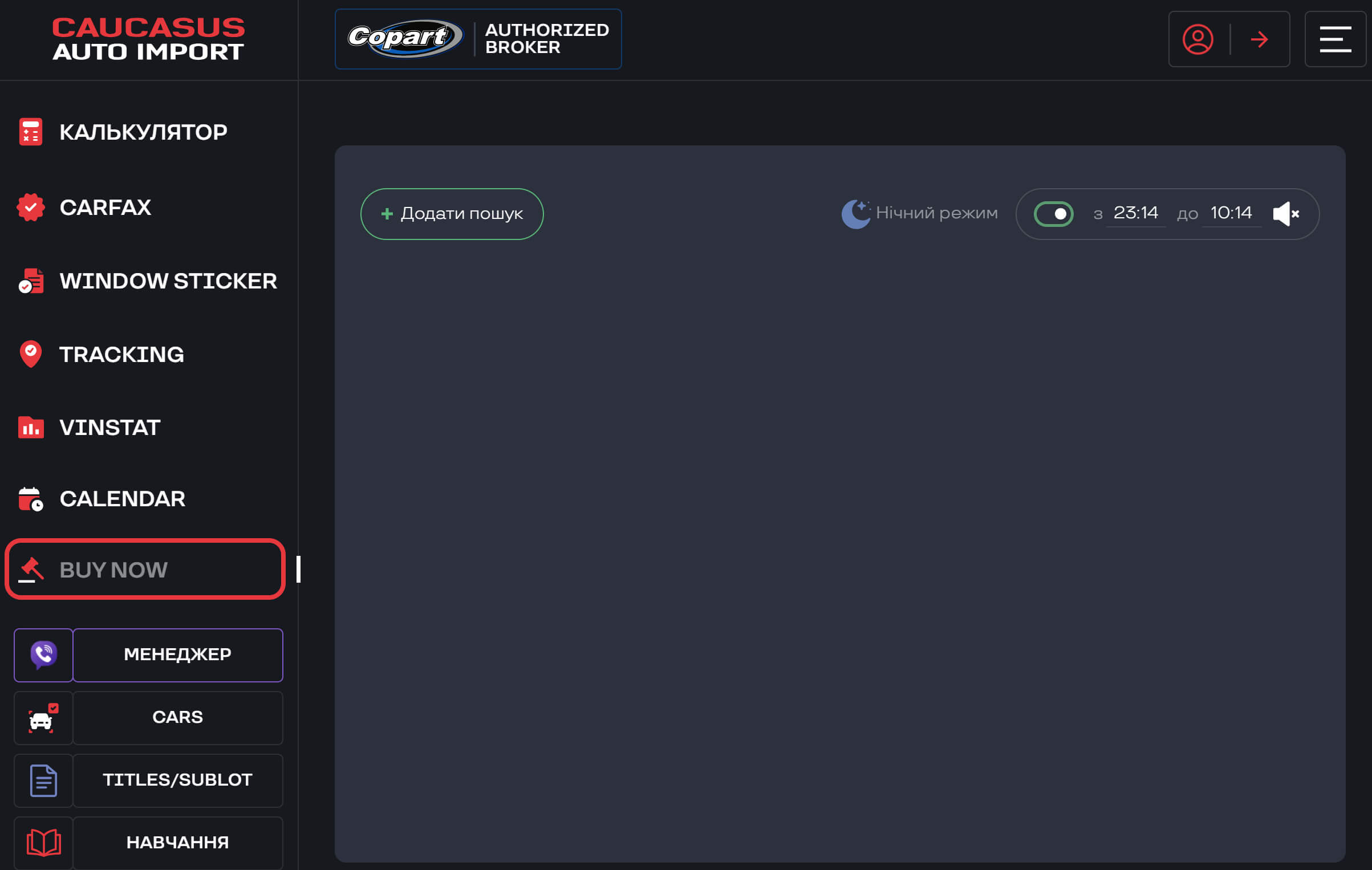 Щоб почати працювати з автоматизованим підбором BuyNow по аукціону Copart, потрібно увійти в особистий кабінет і перейти на відповідний розділ на сайті.